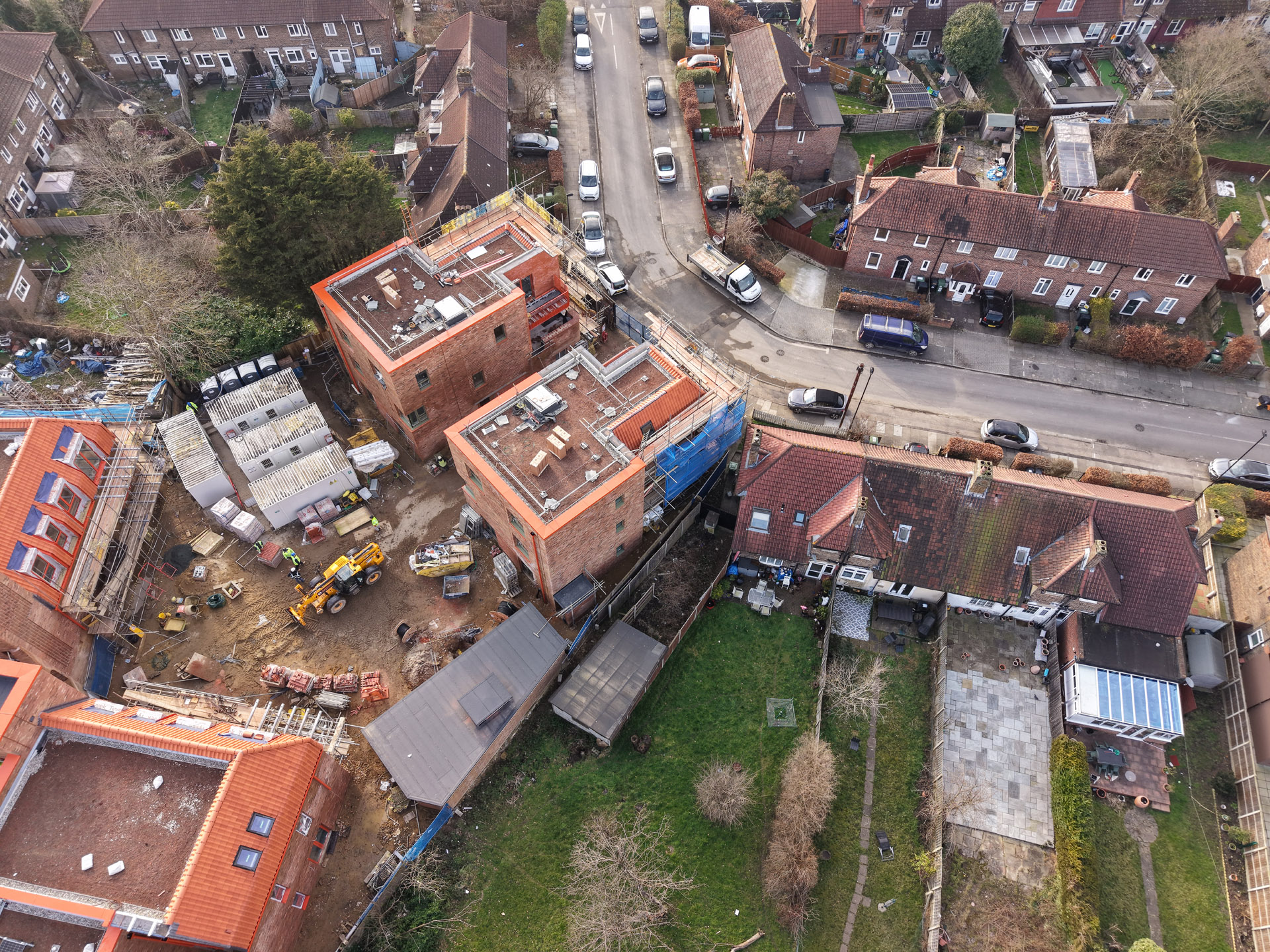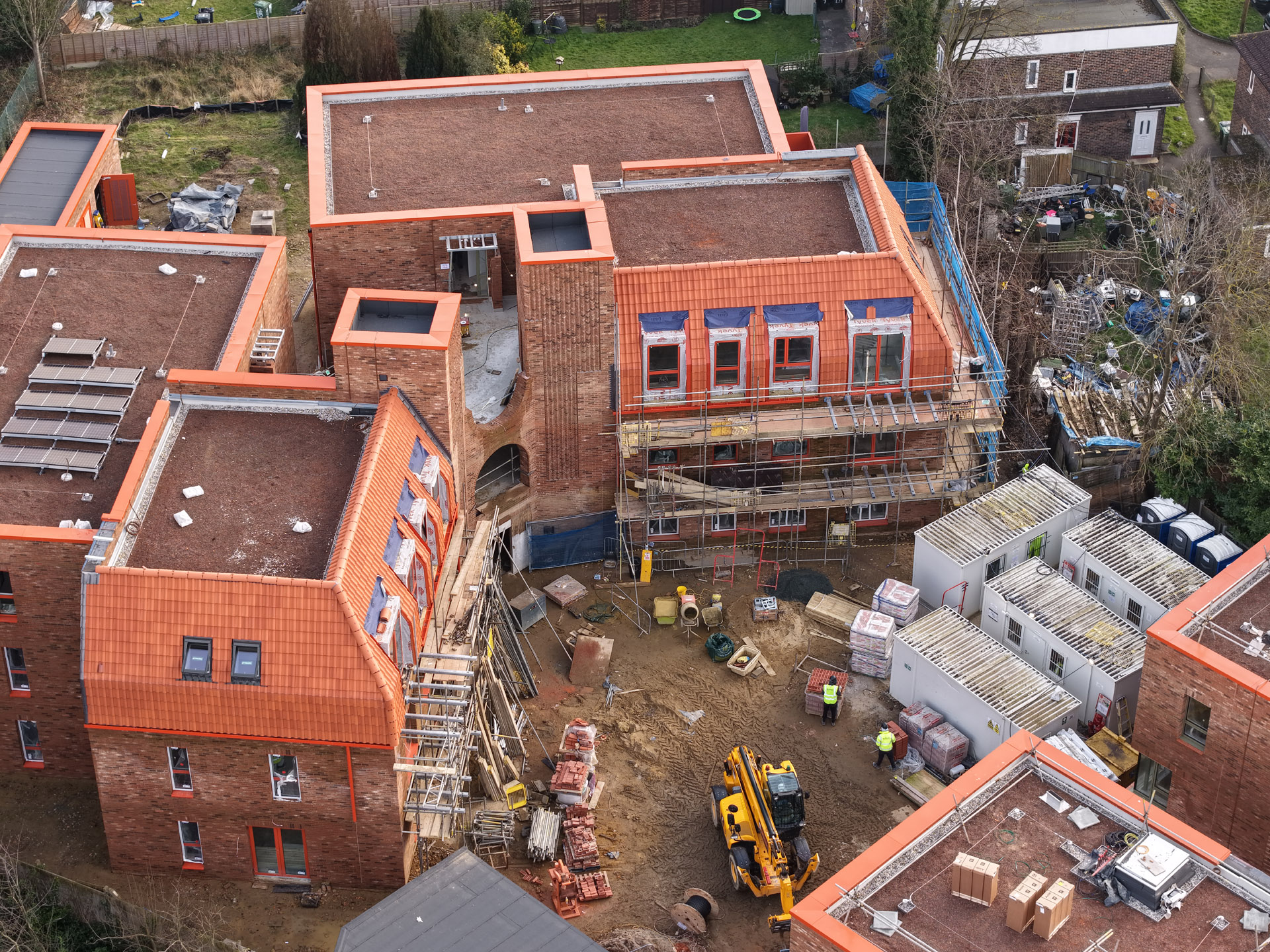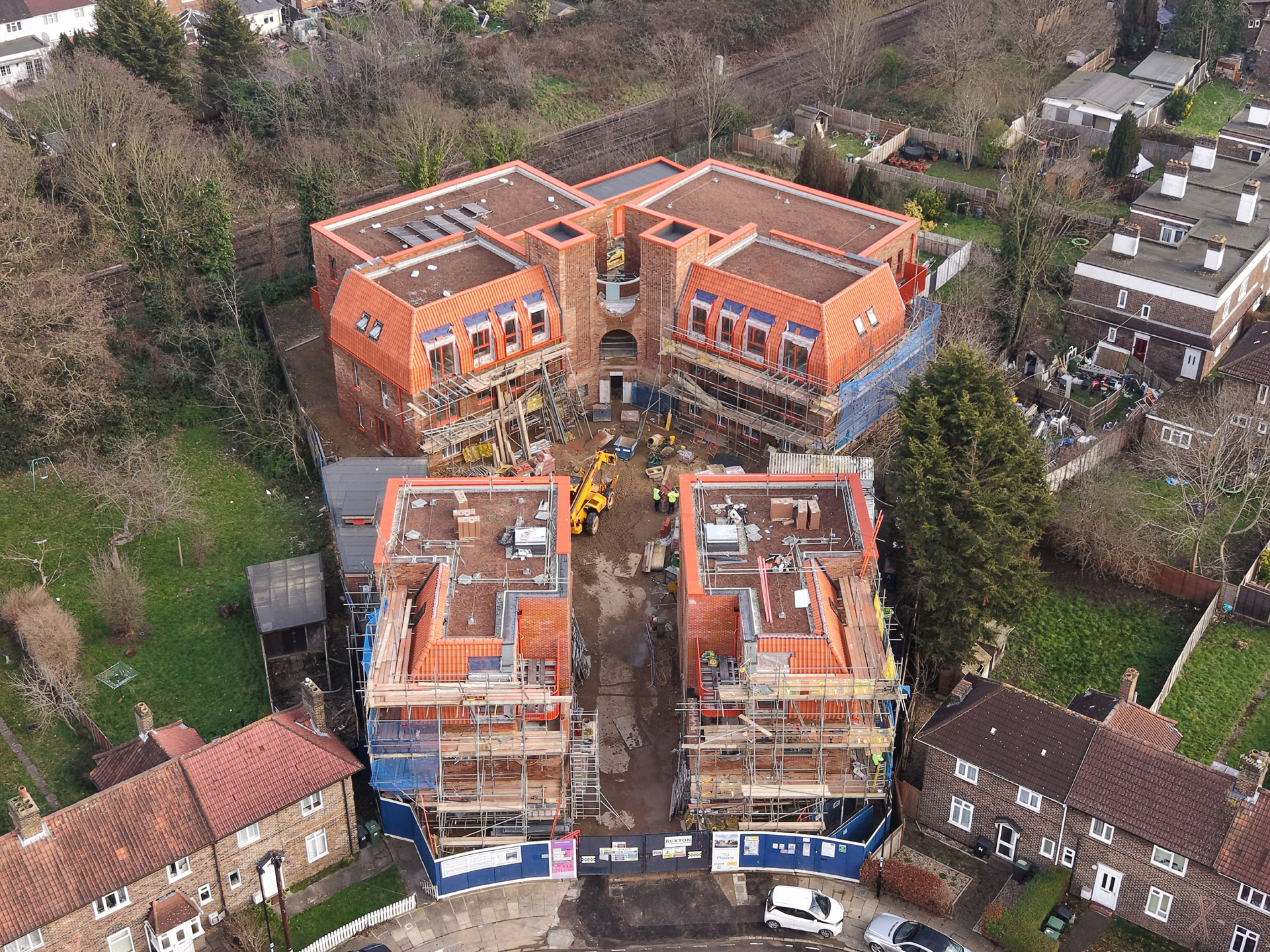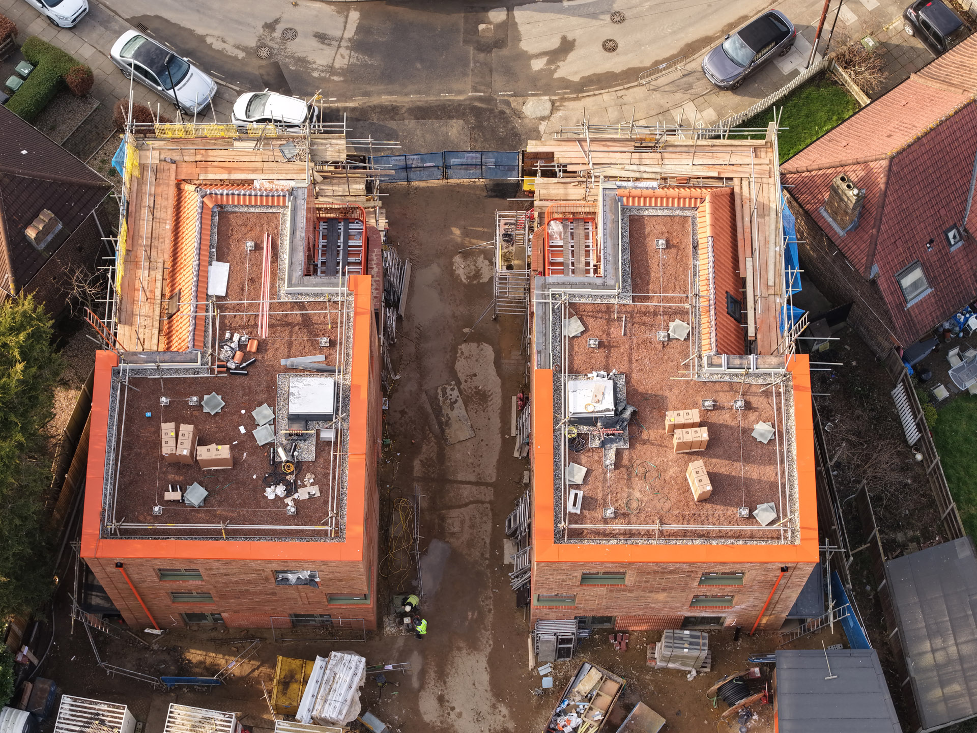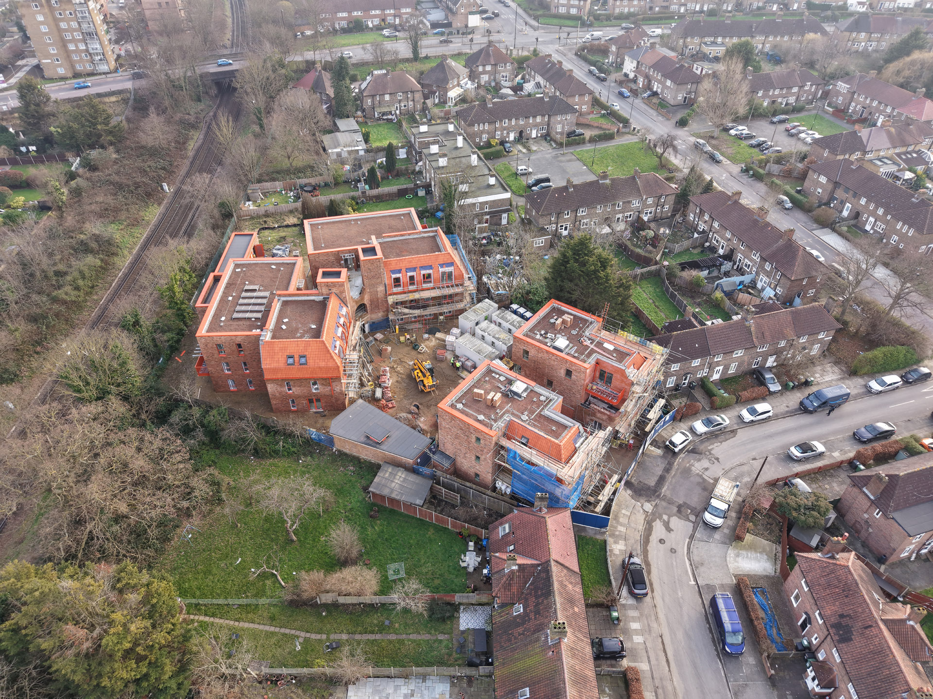 Our role in the Farmstead Road development was to construct 24 sensitively crafted affordable homes commissioned by Phoenix Community Housing, based on a design by Metropolitan Workshop. A core objective was to ensure the new buildings respected and enhanced the local character. This was achieved through the execution of highly distinctive brickwork, which deliberately takes cues from the interwar Arts and Crafts heritage prevalent in the surrounding Bellingham Estate.